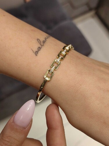 Kare zincir detaylarının şık işçiliği, bu kelepçeyi günlük kullanımda sade ve şık bir tamamlayıcı yaparken, söz, nişan ve düğün gibi özel günlerde de göz alıcı bir aksesuar haline getirir. Sarı altının doğal ışıltısı ve kare zincir deseninin zarafeti, bu tasarımı zamansız bir güzellik haline getirir.