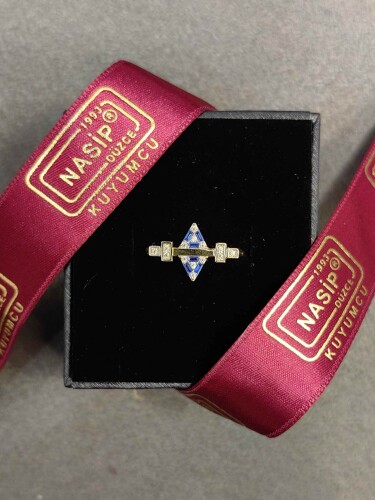 “14 AYAR ÖZEL TASARIM MAVİ TAŞLI MİNİMAL MEKİK ALTIN YÜZÜK” için yorum yapan ilk kişi siz olun