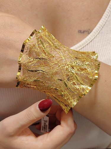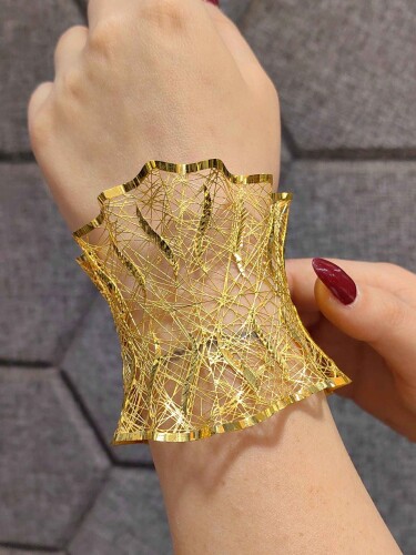 Sonsuz zarafetin simgesi, 14 ayar 585 milyem altından işlenmiş bu tül model altın kelepçe, bileğinizde parıldayan bir sanat eseri. 27.89 gramlık etkileyici ağırlığı ve parlak sarı tonuyla, her bakışta göz kamaştıran bir şıklık sunuyor. Türkiye’nin usta kuyumcuları tarafından 2025 yılında özenle tasarlanıp üretilen bu kelepçe, zarafetinizi bir adım öteye taşıyor.
