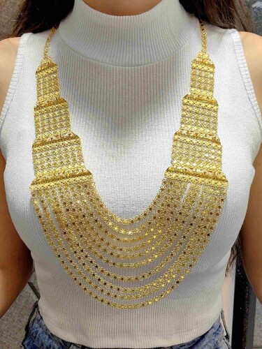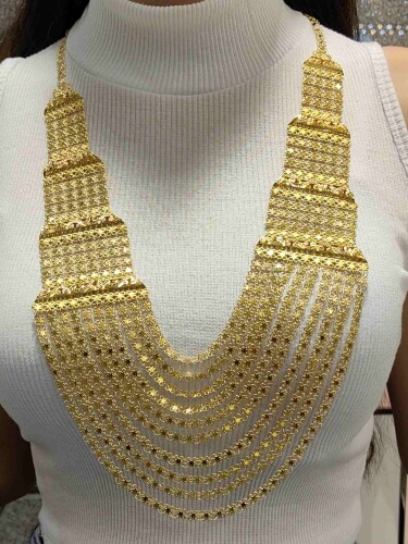 22 Ayar 10 Sıra Özel Üretim Akıtma Kolye, altın şıklığını zarif bir şekilde yansıtan ve göz alıcı bir spor set takımıdır. Sarı altından üretilen ve 22 ayar 916 milyem kalitesinde olan bu kolye, 96 gramlık ağırlığıyla etkileyici bir tasarıma sahiptir. Ürün, standart ölçülerde tasarlanmış olup kadınlar için özel bir seçenektir.