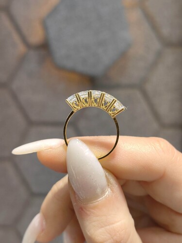 Her biri bir hatırayı, bir hissi, bir sözü anlatan taşlarla bezeli bu özel tasarım beştaş yüzük, klasikleşmiş bir modelin en ince detaylarla yeniden hayat bulmuş hâlidir. YZ002653 kodlu yüzüğümüz, her bakışta duyguları harekete geçiren ışıltısıyla zamansız bir şıklık sunar.
