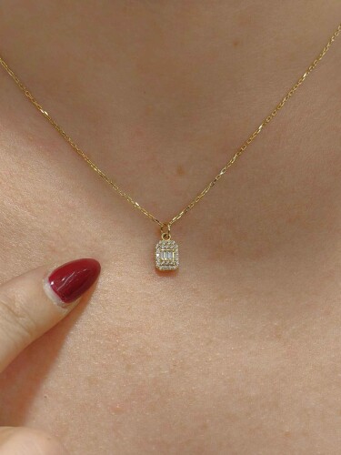 Standart ölçüleriyle her tarza uyum sağlayan bu kolye, günlük hayatta zarafetle kullanılabilirken, söz, nişan ve düğün gibi özel günlerde de şıklığınızı ön plana çıkarır. Baget kesimin incelikle işlendiği tasarım, ışığı eşsiz bir şekilde yansıtarak sofistike bir görünüm sunar.