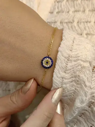 Nazar Altın Bileklik KNY00714, 14 ayar sarı altından üretilmiş olup 1,52 gram ağırlığındadır. Zarif tasarımıyla nazar boncuğu motifleriyle süslenmiş bu bileklik, günlük kullanımda veya özel etkinliklerde şık bir aksesuar olarak kullanılmak üzere tasarlanmıştır.