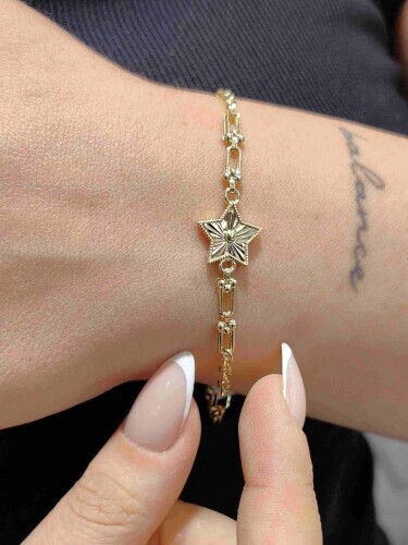 IŞILTILI YILDIZ FİGÜRLÜ FİGARO ÖRME 14 AYAR ALTIN TARZ BİLEKLİK KNY01849